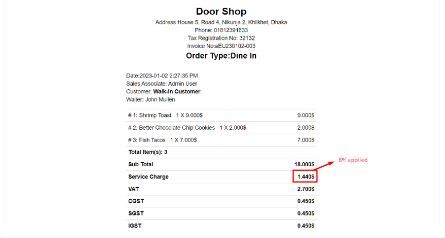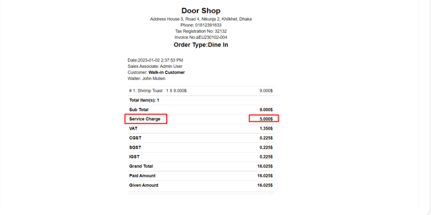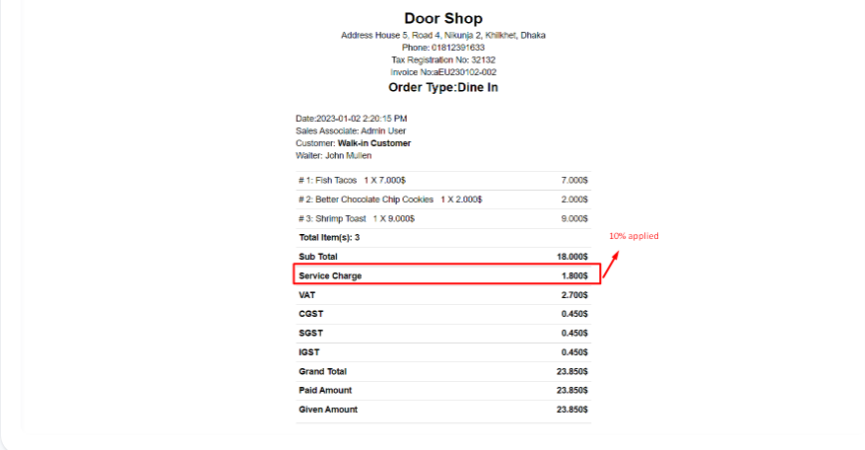 Here in the invoice you can see the "Service" charge added and showing in the invoice.