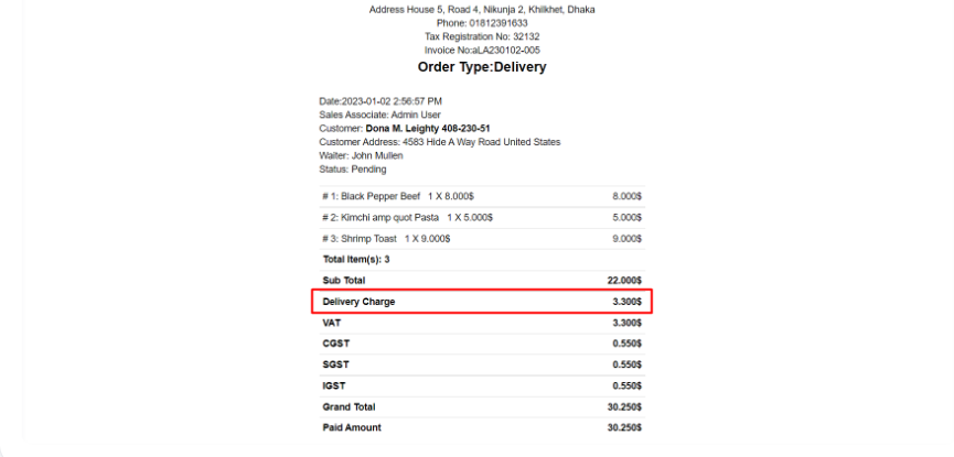 Here in the invoice you can see the "Delivery" charge added and showing in the invoice.